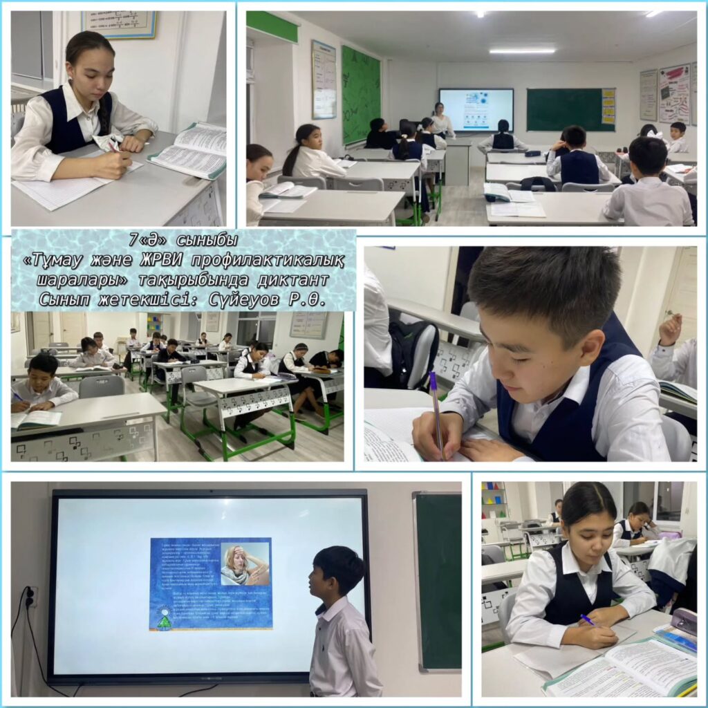 7 «Ә» сыныбында «Тұмау және ЖРВИ профилактикалық шаралары» тақырыбында диктант жұмысы жүргізілді.